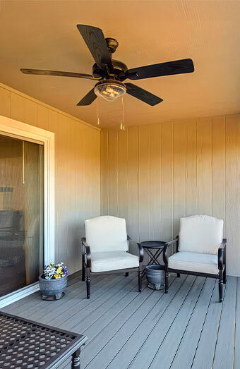 Professional installation of IP-rated weatherproof ceiling fans for decks, patios and verandas, designed to withstand outdoor conditions.